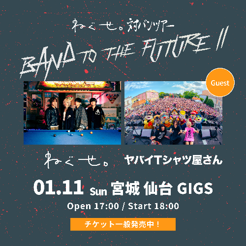 トップページ > 公演スケジュール > 公演情報詳細 ねぐせ。 ねぐせ。対バンツアー「BAND TO THE FUTURE II」 2026/01/11(日) 開場17:00|開演18:00 仙台GIGS 会場情報 券種・料金 スタンディング ¥5,500 ※入場時ドリンク代別途必要 ※未就学入場不可 一般発売 [2025/08/30(土)] ローソンチケット (Lコード:22937) チケットぴあ (Pコード:303-479) e+(イープラス) <以降の先行受付/一般発売で当選・ご購入のお客様>お客様の利便性向上のため、同行者様への電子チケットの分配が事前に行える【自由分配】での電子チケット発券となります。同時に来場頂けない同行者様等へ事前にチケットの分配が可能です。※購入者様ご本人分のチケットは譲渡/分配不可となります。ご了承下さい。お問い合わせフォーム:https://www.gip-web.co.jp/t/info※平日10:00~18:30対応※2~3営業日お時間を頂戴する場合がございます。※ドメイン指定受信、メール指定受信ご利用の方は、「@tayori.com」の受信設定をお願いいたします。※1週間以上お待ちいただいても返答がない場合は、受信設定を変更していただくか、別のアドレスから再度ご連絡ください。 ツイート