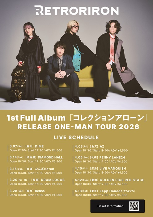 トップページ > 公演スケジュール > 公演情報詳細 レトロリロン RETRORION ONE-MAN TOUR 2026 2026/03/28(土) 開場16:30|開演17:30 Rensa 会場情報 券種・料金 スタンディング ¥4,500 ※入場時ドリンク代別途必要 ・3歳以上チケット必要 ・客席を含む会場内の映像・写真が公開されることがありますので予めご了承ください。 一般発売 [2026/01/14(水)] 発売中 ローソンチケット (Lコード:22860) チケットぴあ (Pコード:305-461) e+(イープラス) お問い合わせフォーム:https://www.gip-web.co.jp/t/info※平日10:00~18:30対応※2~3営業日お時間を頂戴する場合がございます。※ドメイン指定受信、メール指定受信ご利用の方は、「@tayori.com」の受信設定をお願いいたします。※1週間以上お待ちいただいても返答がない場合は、受信設定を変更していただくか、別のアドレスから再度ご連絡ください。 ツイート