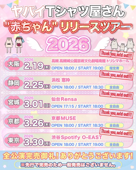 トップページ > 公演スケジュール > 公演情報詳細 ヤバイTシャツ屋さん ヤバイTシャツ屋さん "赤ちゃん" リリースツアー 2026 2026/03/01(日) 開場17:15|開演18:00 Rensa 会場情報 券種・料金 前売 ¥4,800 ※入場時ドリンク代別途必要 ※チケット購入前、公演直前には必ず「注意事項」ご確認下さい。ツアー詳細、チケットのお申し込みはこちら→ https://yabaitshirtsyasan.com/baby/ お問い合わせフォーム:https://www.gip-web.co.jp/t/info※平日10:00~18:30対応※2~3営業日お時間を頂戴する場合がございます。※ドメイン指定受信、メール指定受信ご利用の方は、「@tayori.com」の受信設定をお願いいたします。※1週間以上お待ちいただいても返答がない場合は、受信設定を変更していただくか、別のアドレスから再度ご連絡ください。 ツイート