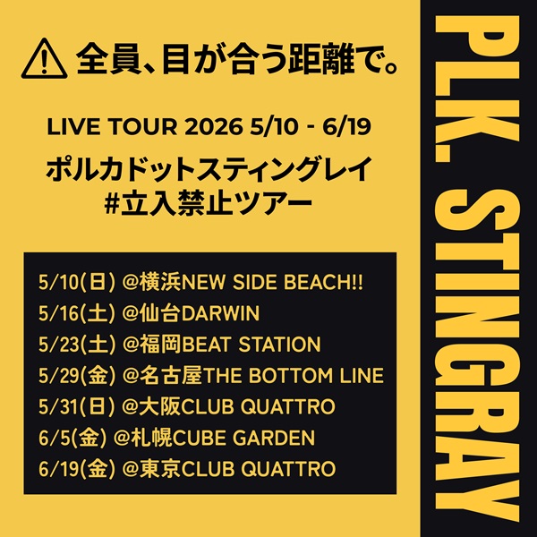 トップページ > 公演スケジュール > 公演情報詳細 ポルカドットスティングレイ ポルカドットスティングレイ #立入禁止ツアー 2026/05/16(土) 開場16:30|開演17:00 仙台darwin 会場情報 券種・料金 スタンディング ¥6,500 ※入場時ドリンク代別途必要 ※未就学児童は入場不可、小学生以上はチケットが必要となります。 ※転売チケット入場不可 一般発売 発売詳細未定 お問い合わせフォーム:https://www.gip-web.co.jp/t/info※平日10:00~18:30対応※2~3営業日お時間を頂戴する場合がございます。※ドメイン指定受信、メール指定受信ご利用の方は、「@tayori.com」の受信設定をお願いいたします。※1週間以上お待ちいただいても返答がない場合は、受信設定を変更していただくか、別のアドレスから再度ご連絡ください。 ツイート