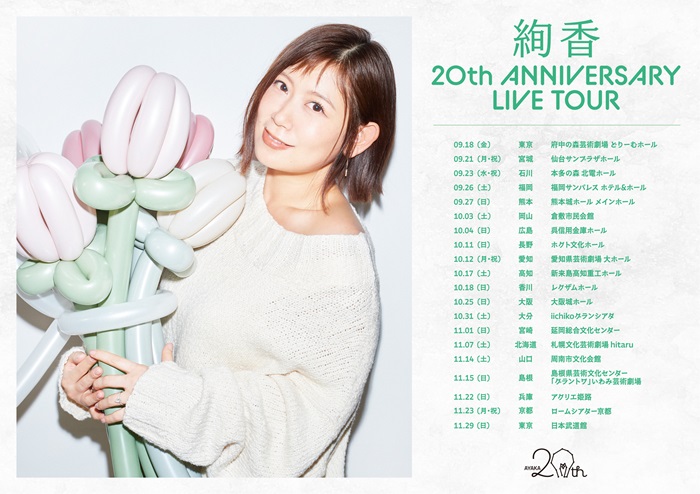 トップページ > 公演スケジュール > 公演情報詳細 絢香 20th ANNIVERSARY LIVE TOUR 本ツアーでは、デビュー当時から長く愛されてきた代表曲はもちろん、最新楽曲まで、20周年だからこそ実現するメモリアルなセットリストでお届けします。20年の軌跡と、今の絢香の歌声が重なる特別なライブ。ぜひ会場で、この瞬間を一緒に体感してください! 2026/09/21(月・祝) 開場16:00|開演17:00 仙台サンプラザホール 会場情報 券種・料金 全席指定 ¥9,900 *未就学児童のご入場は出来ません。 一般発売 発売詳細未定 注意事項は SPECIAL SITE をご確認ください。お問い合わせフォーム:https://www.gip-web.co.jp/t/info※平日10:00~18:30対応※2~3営業日お時間を頂戴する場合がございます。※ドメイン指定受信、メール指定受信ご利用の方は、「@tayori.com」の受信設定をお願いいたします。※1週間以上お待ちいただいても返答がない場合は、受信設定を変更していただくか、別のアドレスから再度ご連絡ください。 ツイート