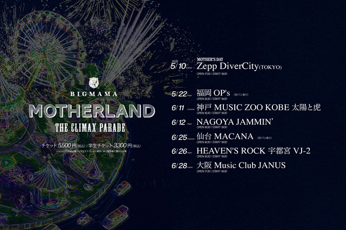 トップページ > 公演スケジュール > 公演情報詳細 BIGMAMA MOTHERLAND 〜The Climax Parade〜 2026/06/25(木) 開場18:30|開演19:00 仙台MACANA 会場情報 券種・料金 全自由(通常) ¥5,500 全自由(学生) ¥3,300 ※入場時ドリンク代別途必要 一般発売 発売詳細未定 ※学生チケットは入場時に身分証明書の提示が必要・未就学児童のご入場は出来ません(小学生以上チケット必要)※ダイブ・モッシュ等危険行為は一切禁止お問い合わせフォーム:https://www.gip-web.co.jp/t/info※平日10:00~18:30対応※2~3営業日お時間を頂戴する場合がございます。※ドメイン指定受信、メール指定受信ご利用の方は、「@tayori.com」の受信設定をお願いいたします。※1週間以上お待ちいただいても返答がない場合は、受信設定を変更していただくか、別のアドレスから再度ご連絡ください。 ツイート