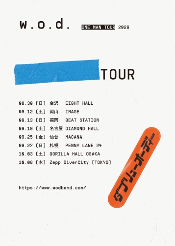 トップページ > 公演スケジュール > 公演情報詳細 w.o.d. 2026 ONE MAN TOUR 2026/09/25(金) 開場18:30|開演19:00 仙台MACANA 会場情報 券種・料金 オールスタンディング ¥4,800 ※入場時ドリンク代別途必要 ※未就学児童入場不可(小学生以上チケット必要) 一般発売 発売詳細未定 お問い合わせフォーム:https://www.gip-web.co.jp/t/info※平日10:00~18:30対応※2~3営業日お時間を頂戴する場合がございます。※ドメイン指定受信、メール指定受信ご利用の方は、「@tayori.com」の受信設定をお願いいたします。※1週間以上お待ちいただいても返答がない場合は、受信設定を変更していただくか、別のアドレスから再度ご連絡ください。 ツイート